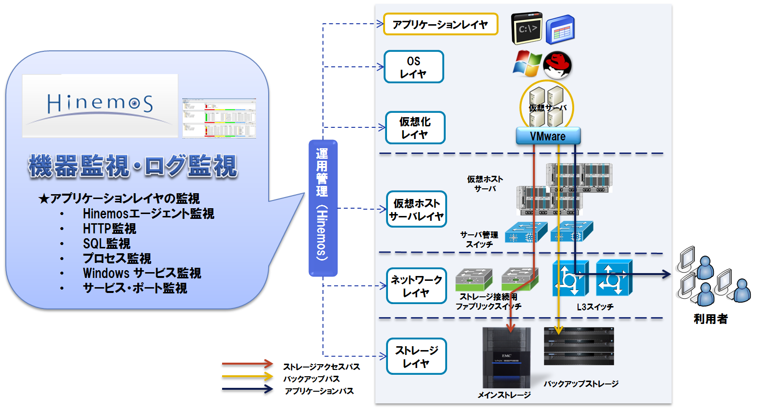 Hinemosの採用により、アプリケーションレイヤやOSレイヤなど、構成機器の全レイヤーに対して一元管理を実現し、アプリケーションレイヤも含めた監視やジョブ管理も可能となっています。また、ハイパーバイザーにはVMwareを採用しており、Hinemos VM管理オプションを導入することで仮想環境に対する一元管理も実現しています。