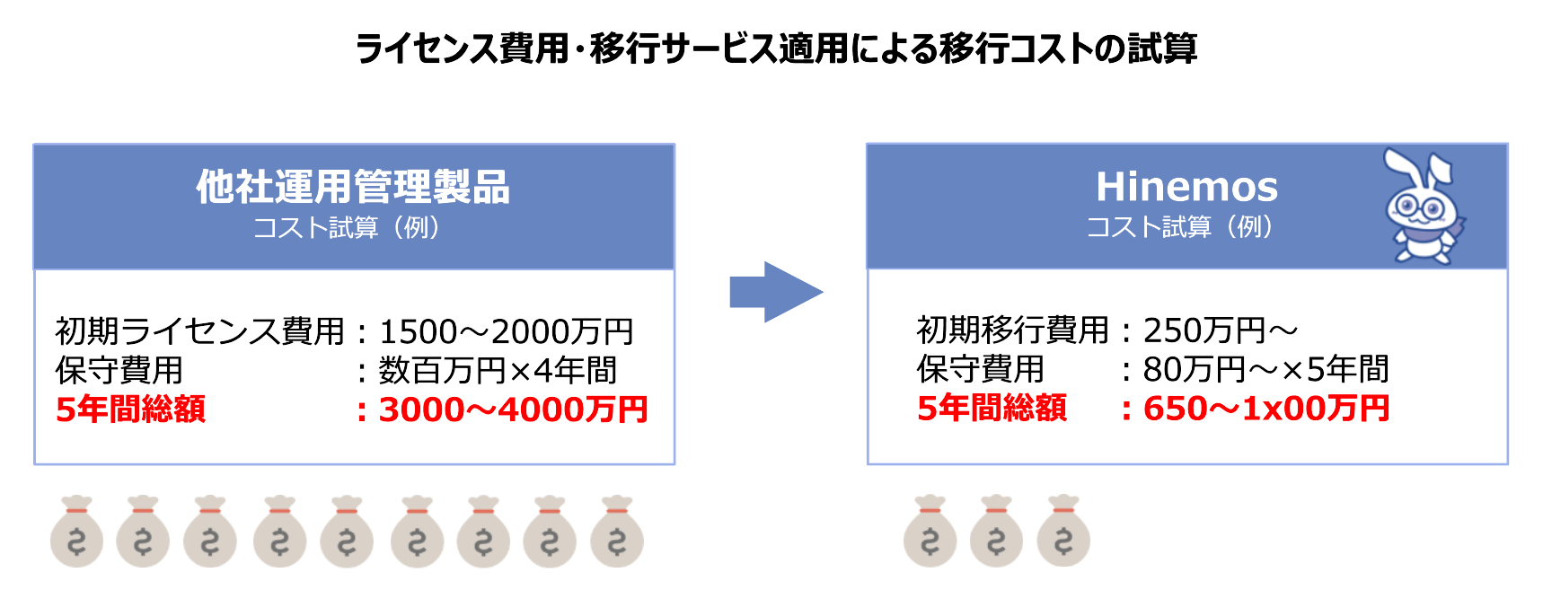 過去実際に行われた「現行の製品を使い続けたほうが良いか」または「Hinemosに移行した方が良いか」の製品比較事例ですが、ライセンスコスト+移行コストを合わせても、5年間トータルで十分なコスト削減を達成でき、その結果Hinemosへの移行を判断頂いたケースもございました。