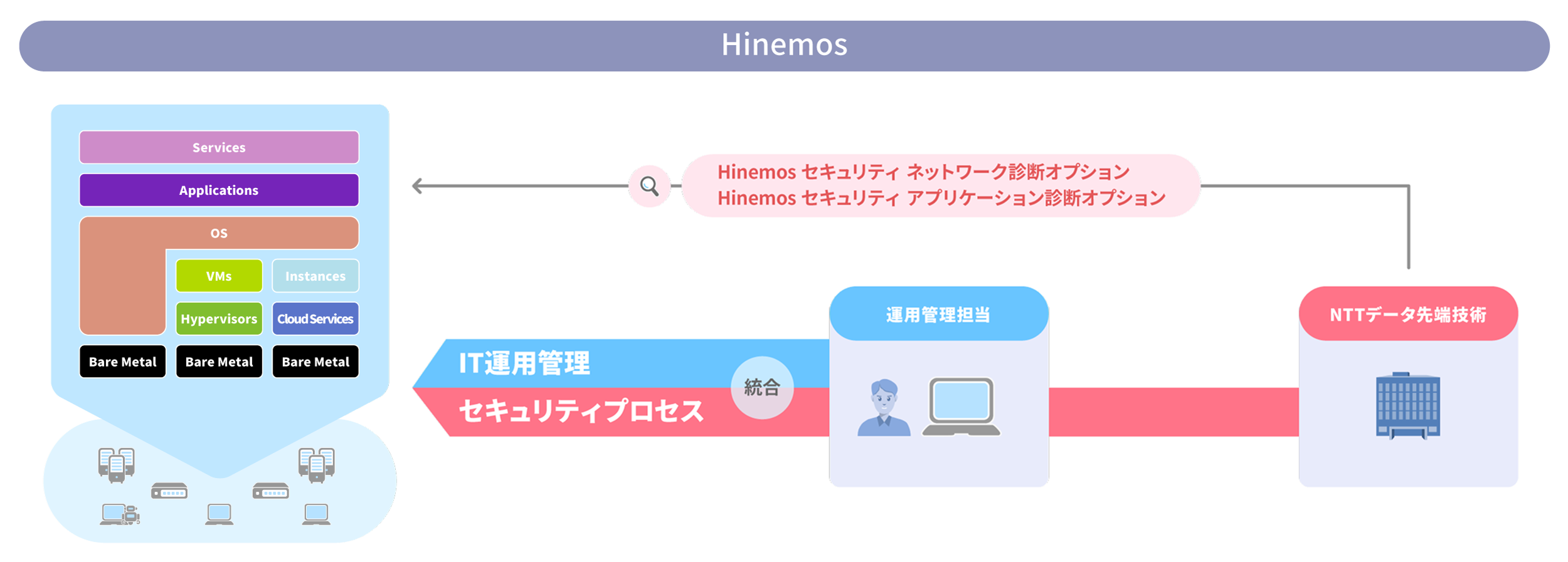 Hinemosがこれまで提供する監視やジョブ管理、ITSMといったIT運用管理に、セキュリティプロセスを追加することでITセキュリティ運用を追加するオプションです。
