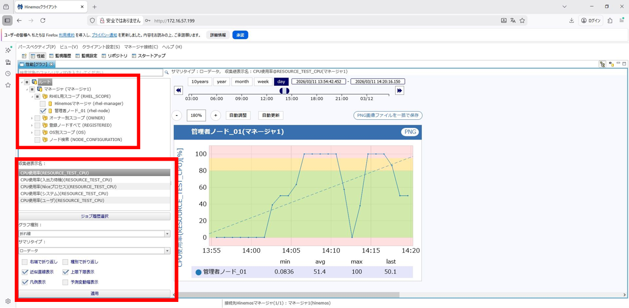 2.「性能[グラフ]」ビュー上の「ルート>マネージャ(マネージャ1)>RHEL用スコープ(RHEL_SCOPE)>管理者ノード_01(rhel-node)」を選択します。収集表示名に「CPU使用率(RESOURCE_TEST_CPU)」を選択し、以下のように、グラフ種別などの項目を設定します。「性能[グラフ]」ビュー最下部の「適用」ボタンをクリックすると、グラフ上でCPUリソースの利用状況をグラフで確認できます。