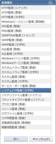4. 「監視種別」ダイアログから「システムログ監視 (文字列)」を選択し、「次へ」をクリックします。
