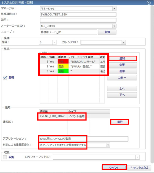 5. 表示された「システムログ[作成・変更]」ダイアログでは、入力必須項目は背景色がピンク色で表示されます。以下のように、「監視項目ID」、「スコープ」などの必須項目と「判定」条件を設定します。また、通知方法はデフォルトの「EVENT_FOR_TRAP」(イベント通知)を選択します。