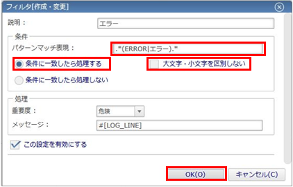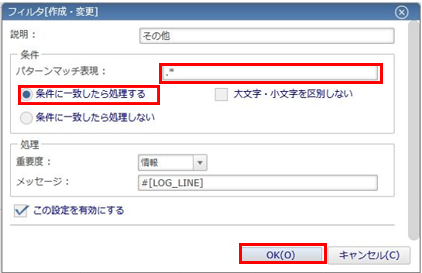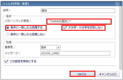 - ◆判定の順番については順序が若い順に判定され、パターンマッチ表現に合致したら、それ以降の条件は確認されません。判定条件の順番を変えたい場合は、対象のパターンマッチ表現を選択し、「上へ」ボタンと「下へ」ボタンを押すことで入れ替えることができます。 以上で、システムログ監視の設定は完了です。