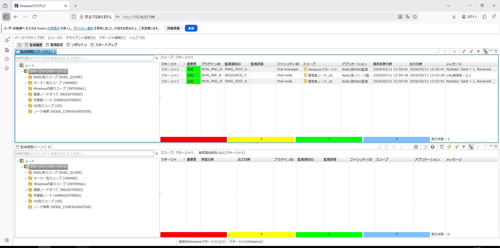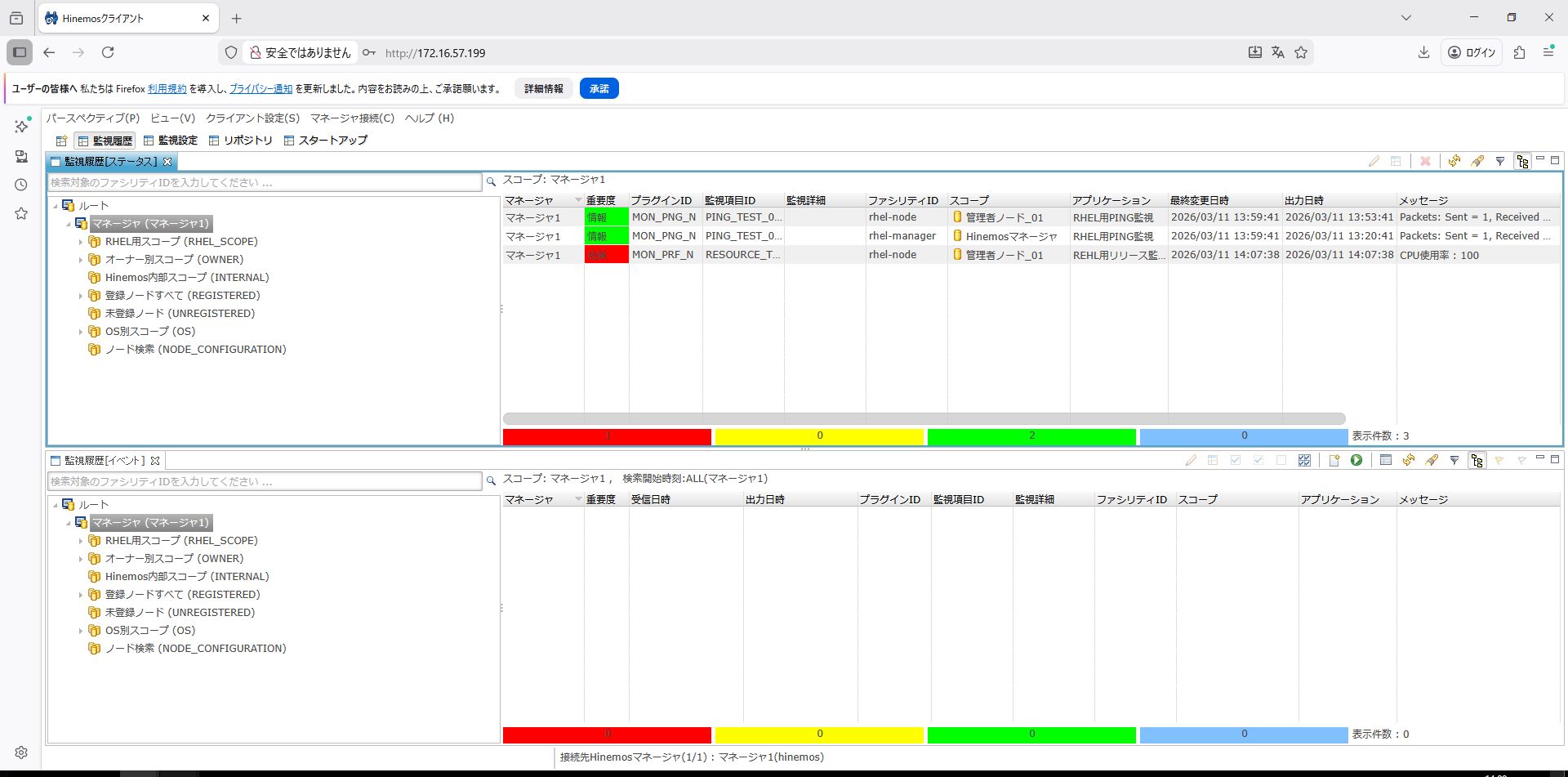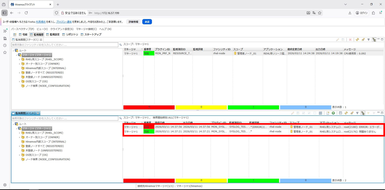3. 「監視履歴[イベント]」ビューで右上のツールバーにある「更新」ボタンをクリックし、緑色の重要度:情報のイベントと赤色の重要度:危険のイベントが表示されることを確認します。
