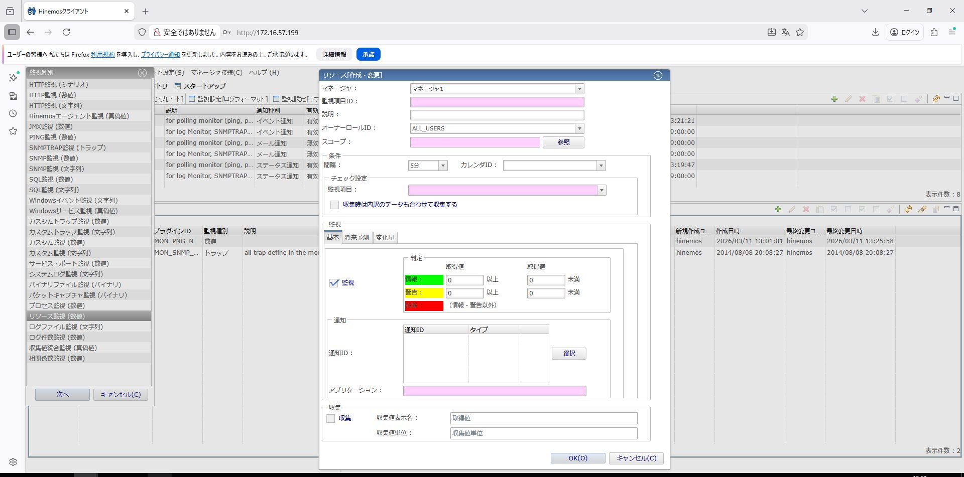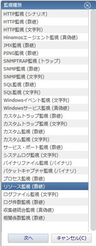 4. 「監視種別」ダイアログから「リソース監視 (数値)」を選択し、「次へ」をクリックします。そして、作成・変更ダイアログが表示されます。