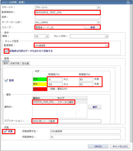 5. 「リソース[作成・変更]」ダイアログでは、入力必須項目は背景色がピンク色で表示されます。以下のように、「監視項目ID」、「スコープ」などの必須項目を入力し、「判定」の取得値と通知を設定します。なお、通知方法はデフォルトの「STATUS_FOR_POLLING」を選択します。
