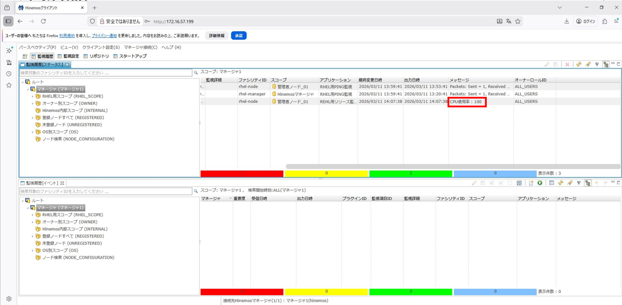 2.管理対象ノードで特に処理が行われていない場合は、負荷が低く設定した閾値を超えないため通知は発生しません。そのため、監視対象ノードの負荷を上げ、検知されるような事象を意図的に発生させてみましょう。
