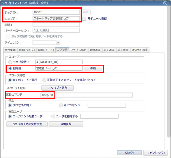 - ◆起動コマンド:対象のノード上で実行する「コマンド」もしくは「シェルスクリプト」を指定します。