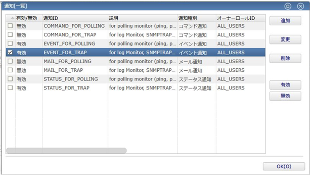 4. 「通知先の指定」タブを開き、通知方法を指定します。ここでは、通知方法としてデフォルトの通知設定である「EVENT_FOR_TARP」を選択して、「OK」ボタンを押下します。