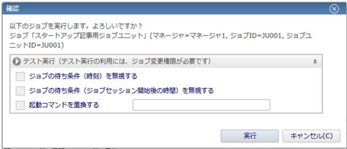先程作成したジョブユニット(もしくはジョブネット、コマンドジョブ)を選択した状態で、ジョブ設定[一覧]ビューの右上にある「実行」ボタンを押下します。