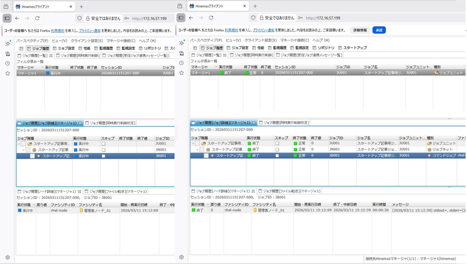 ジョブ履歴[一覧]ビューでジョブの実行結果(実行中であれば現在の実行状態)を確認することができます。なお、ジョブ履歴[一覧]ビューで対象を選択するとジョブ履歴[ジョブ詳細]ビューにそのジョブの詳細が表示されます。また、ジョブ履歴[ジョブ詳細]ビューで対象を選択するとジョブ履歴[ノード詳細]ビューに実行したジョブのノード単位の結果が表示されます。