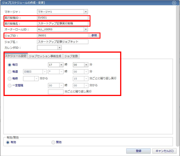 実行契機ID、実行契機名、ジョブID、スケジュール設定を指定します。