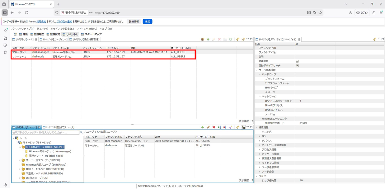 入門編①で構築したマネージャと対象ノードを利用します。IPアドレスなど、システム構成の詳細については、入門編①の『本ドキュメントで構築するシステム構成』をご参照ください。また、ノードとスコープの設定がされていない場合も、入門編①の『2. 管理対象の登録』と『3. スコープの作成』を参考に、ノードとスコープを作成してください。