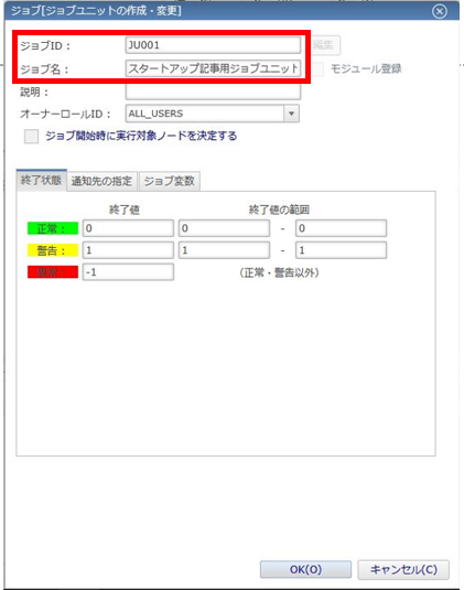 3. ジョブ[ジョブユニットの作成・変更]ダイアログでは、入力必須項目の背景色はピンク色で表示されます。以下のように、「ジョブID」と「ジョブ名」を指定して「OK」ボタンを押下します。