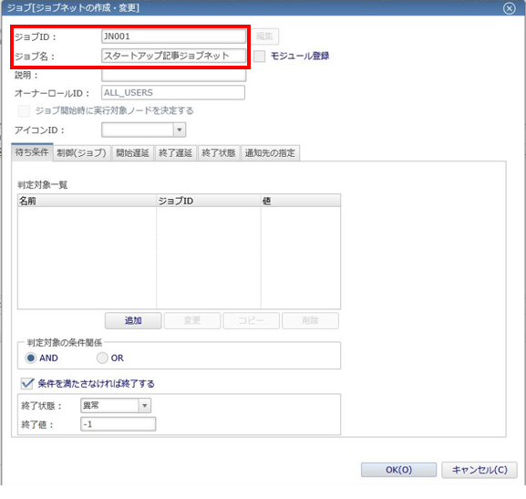 2. ジョブ[ジョブネットの作成・変更]ダイアログでは、「ジョブID」と「ジョブ名」を指定して「OK」ボタンを押下します。
